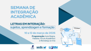 Estudantes do curso de Letras na modalidade EaD, da SEDIS/UFRN participam, entre os dias 10 e 12 de março de 2026, da Semana de Integração Acadêmica – Letras em Interação: sujeitos, aprendizagem e formação. O evento reúne atividades formativas, debates acadêmicos e momentos de orientação voltados ao início do semestre letivo.